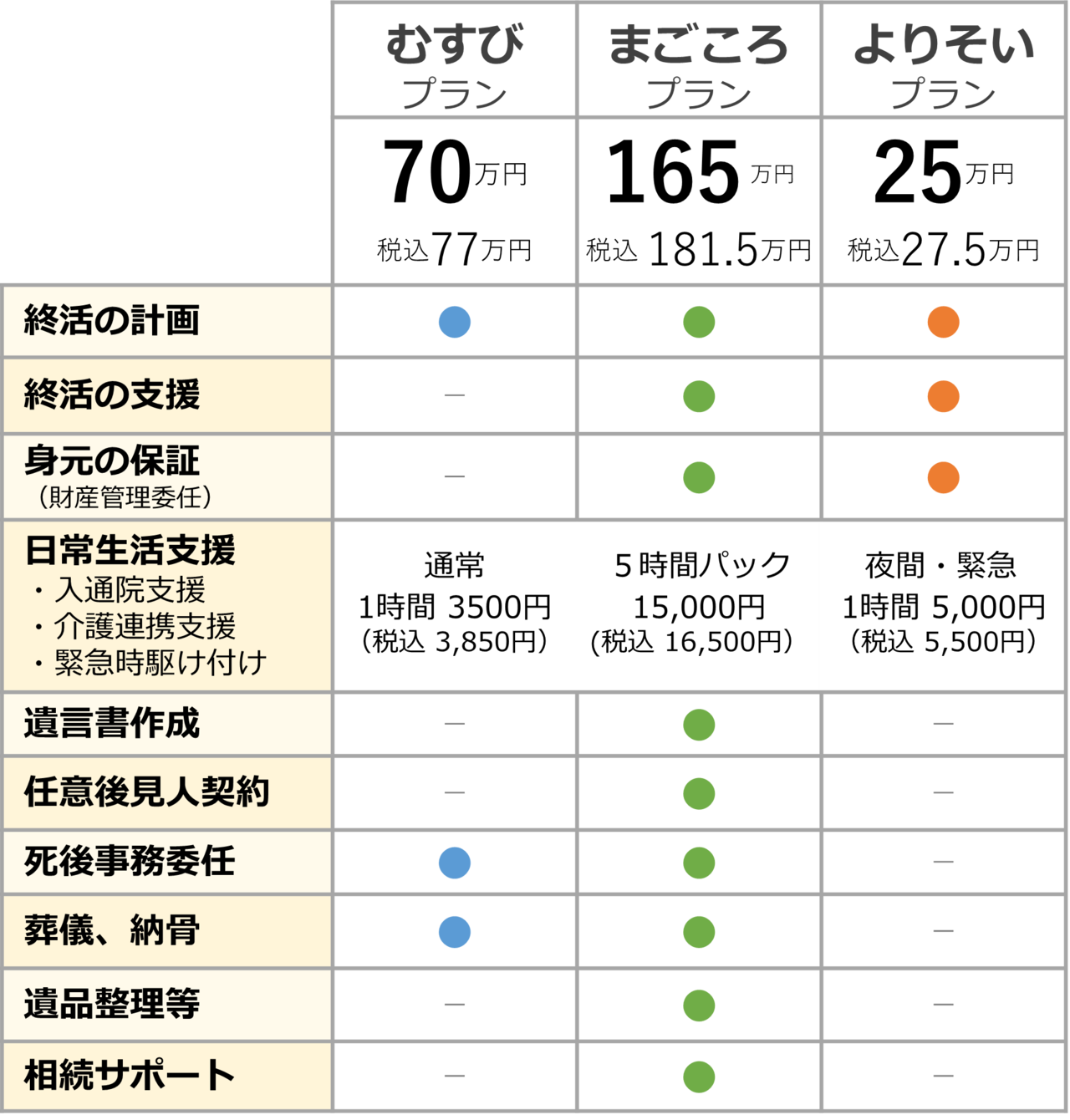 | まごころ | 165万円 (税込181.5円) | 終活のスタートから、日常生活のサポート、ご逝去後のことまで相談する相手や余生の伴走者が欲しい方など |